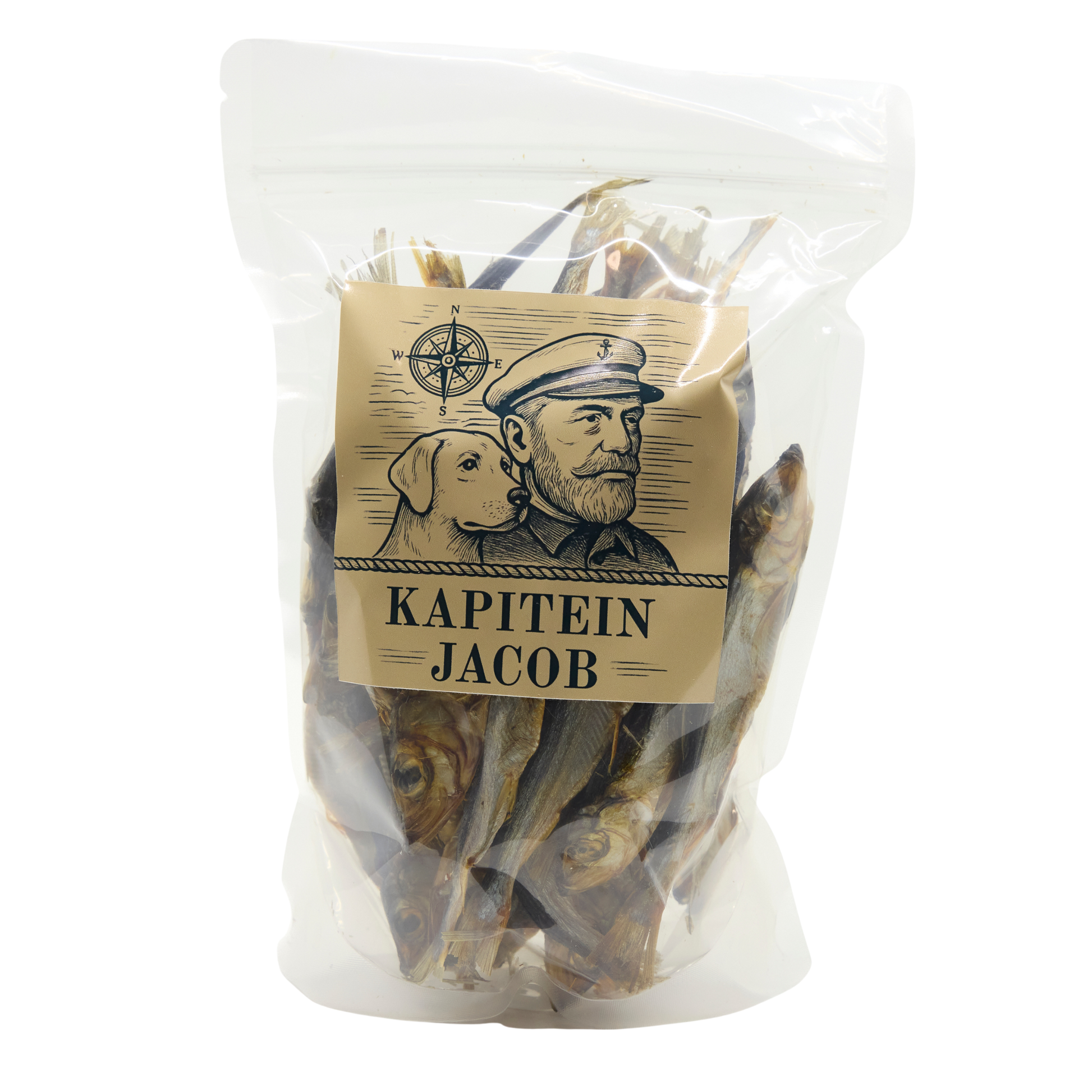 De gedroogde haringen van Kapitein Jacob worden geleverd in een stevige, hersluitbare verpakking om versheid en kwaliteit te behouden.